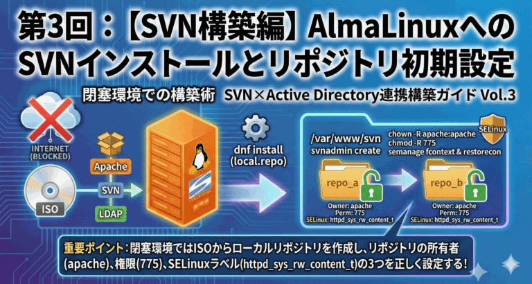 はじめに 第2回でActive Directory側の準備が整いました。第3回では、Subversion(SVN)の本体をAlmaLinuxにインストールし、リポジトリを作成します。 単にインストールするだけでなく、インターネットに接続できない「閉塞 […]