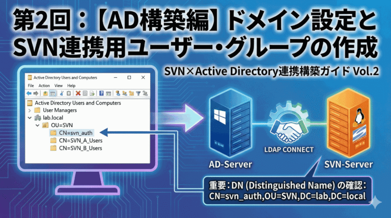 はじめに 第1回でサーバーの土台とネットワークが完成しました。第2回では、Windows Serverを「ドメインコントローラー」として構成し、Subversion(SVN)からの認証リクエストを受け入れるための準備を行います。 単にユーザーを作るだ […]