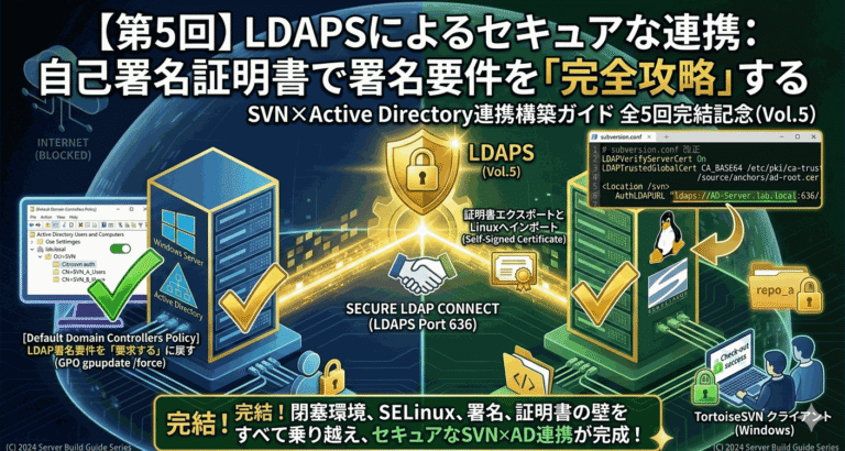 はじめに 第4回でSVNとADの連携は成功しました。しかし、セキュリティポリシーが厳しい現場では「AD側の署名要件を『なし』にするなんて許されない」というケースがあります。 今回はその「課題」を片付けます。通信を暗号化(SSL/TLS)するLDAPS […]