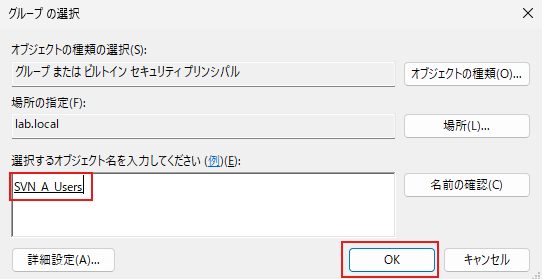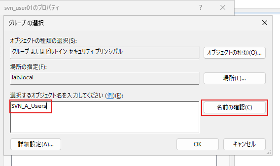 グループ名の入力: 「選択するオブジェクト名を入力してください」の欄に、参加させたいグループ名(例:SVN_A_Users)を入力し、[名前の確認] をクリックします。