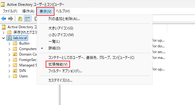 「Active Directory ユーザーとコンピューター」の表示メニューで「拡張機能」にチェックを入れます。
