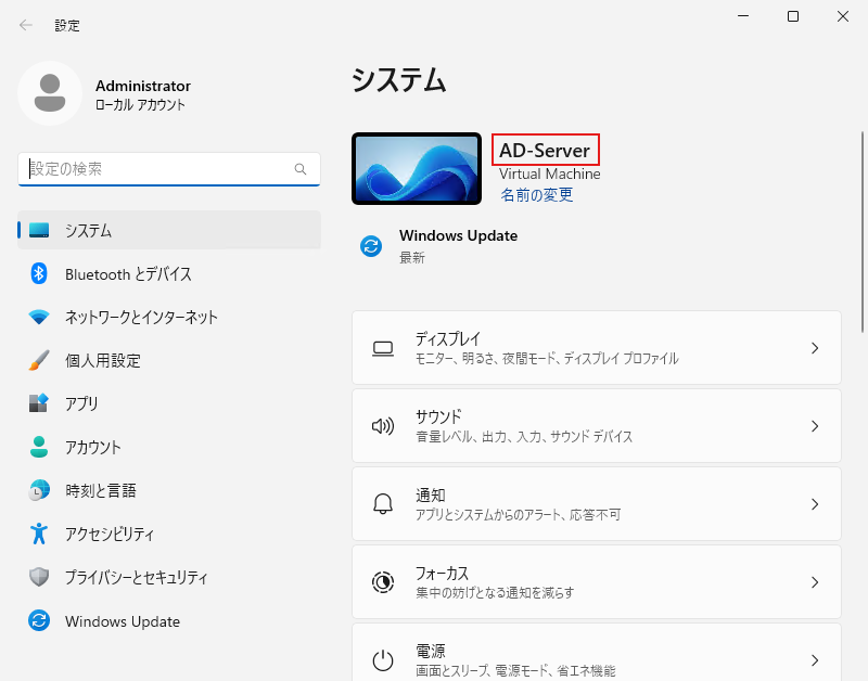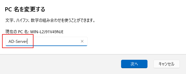 Active Directoryの役割を入れる前に、必ずコンピュータ名をわかりやすい名前(ここでは AD-Server )に変更して再起動してください。