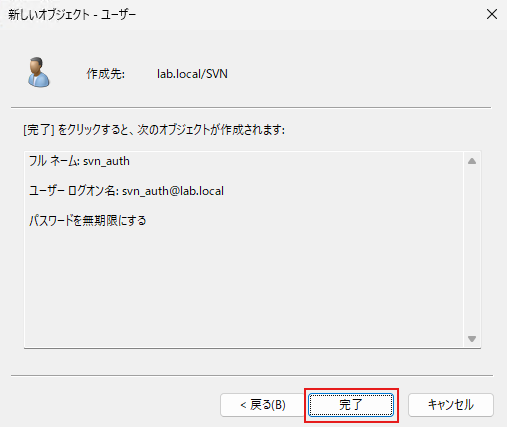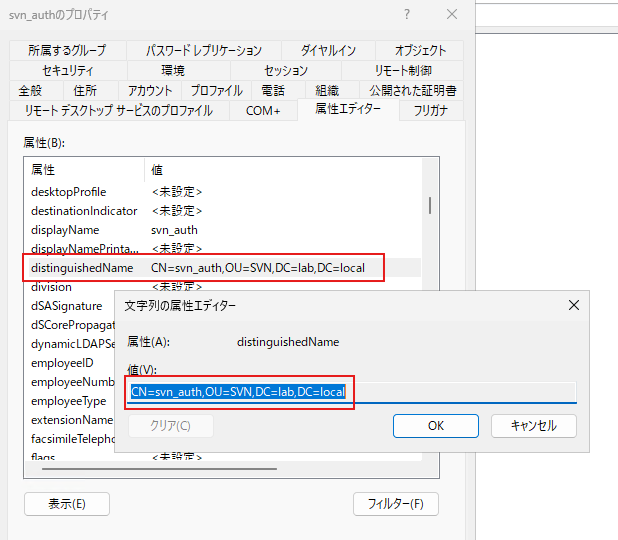 例: CN=svn_auth,OU=SVN,DC=lab,DC=local