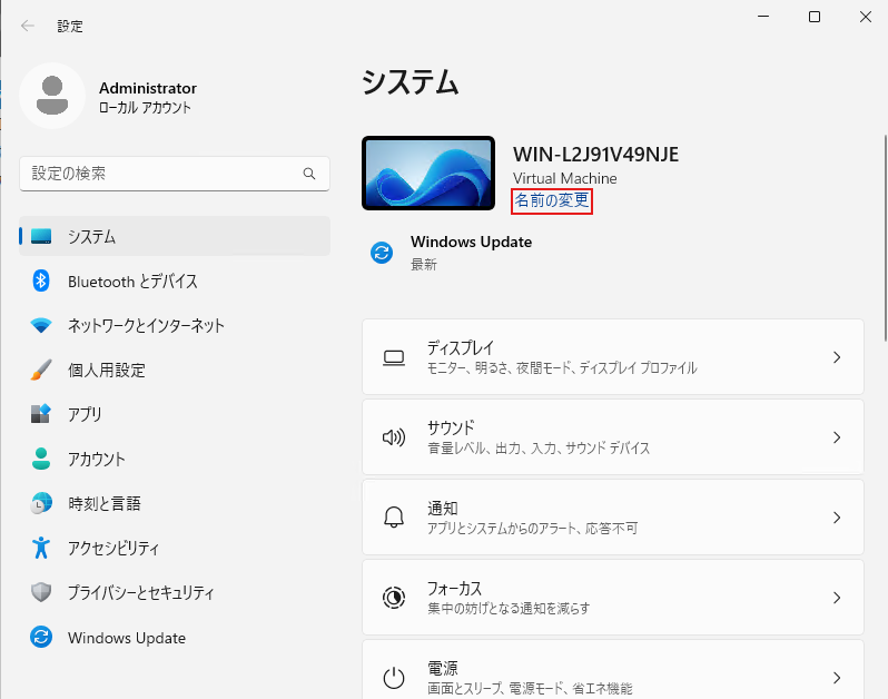 - 「win + i 」で設定を開き、「名前の変更」をクリックします。