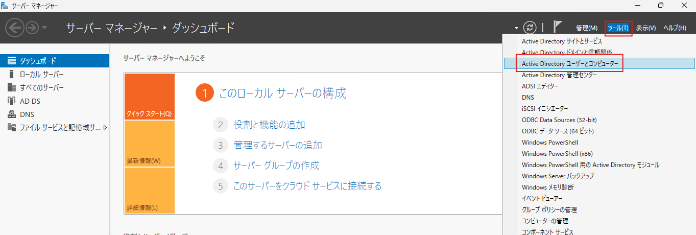 「サーバマネージャ」上で、下記の ツール>Active Directory ユーザーとコンピューター をクリックして開きます。