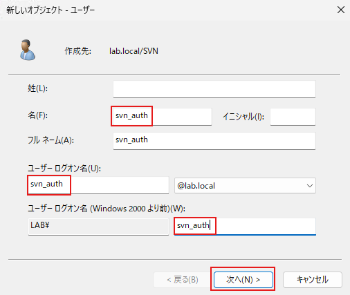 下記のようにユーザ名「svn_auth」を入力し、「次へ」をクリックします。