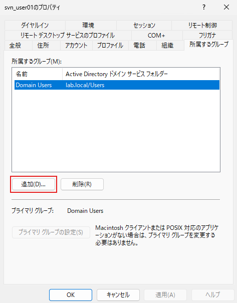 ユーザーとグループの作成が終わったら、次は各ユーザーを適切なグループに所属させます。Active Directoryでは、ユーザーのプロパティから簡単に追加できます。