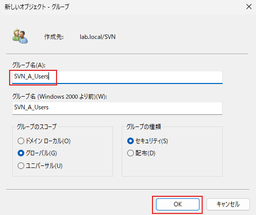 グループ名「SVN_A_Users」を記入し、「OK」をクリックしてグループを作成します。