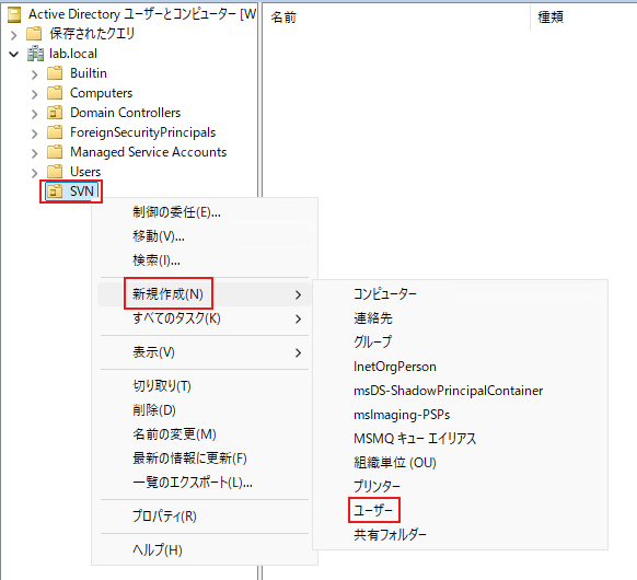 SVN専用のOU(組織単位)を作成する