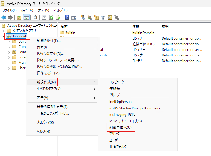 ドメイン(lab.local)を右クリック > 新規作成 > 組織単位(OU) をクリックして、OU(組織単位)作成画面を開きます。