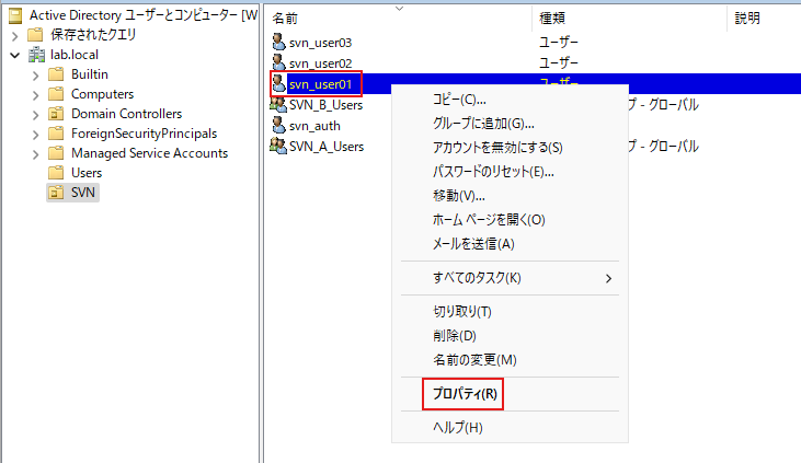「OU=SVN」の中に作成したユーザー(例:svn_user01)を右クリックし、[プロパティ] を開きます。