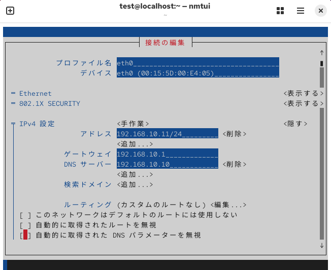 ①設定ツールの起動:ターミナルで nmtui と入力します(GUIがない場合でも使いやすいツールです)。