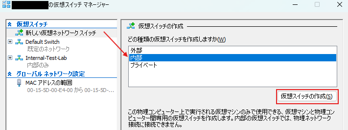 ここが今回の最重要ポイントです。外部(インターネット)から遮断された「閉塞環境」を作るため、Hyper-Vの「仮想スイッチマネージャー」で「内部スイッチ」を作成します。