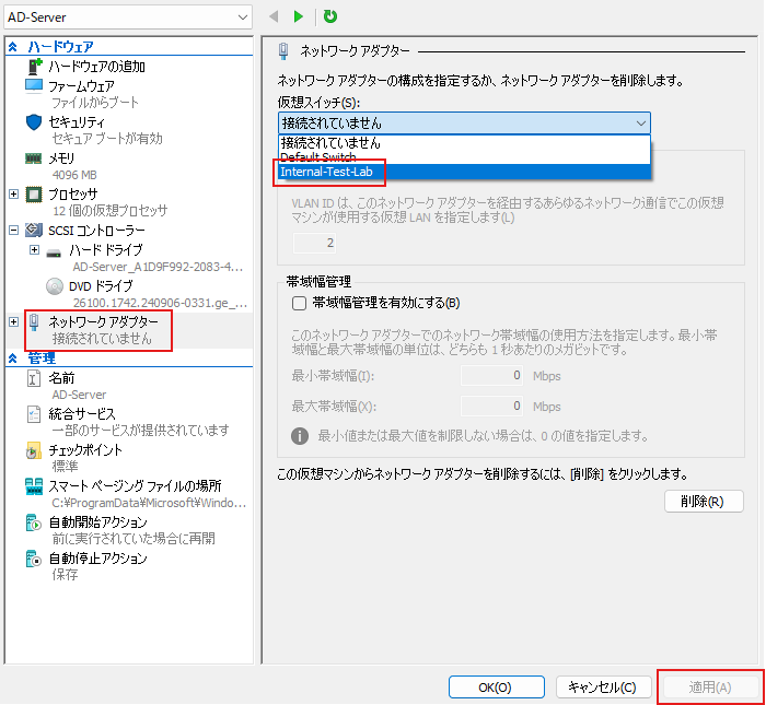 仮想マシン「AD-Server」>設定>ネットワークアダプタを開き、下記のように作成した内部スイッチ(Internal-Test-Lab)を指定します。