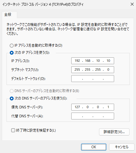 (デフォルト)ゲートウェイについて 今回の環境は「閉塞環境」のため、基本的には空欄(設定なし)で問題ありません。 ただし、OSの設定画面で「接続が不完全です」といった警告が出るのを避けたい場合や、将来的に他のネットワークと繋ぐ予定がある場合は、慣習的に